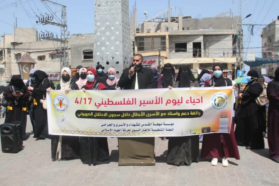 نظمت مؤسسة مهجة القدس للشهداء والأسرى والجرحى والإطار النسوي لحركة الجهاد الإسلامي، صباح اليوم، وقفةً دعم وإسناد للأسرى في السجون الصهيونية ضمن فعاليات يوم الأسير الفلسطيني، أمام دوار العلم ببني سهيلا شرقي مدينة خانيونس جنوبي قطاع غزة.