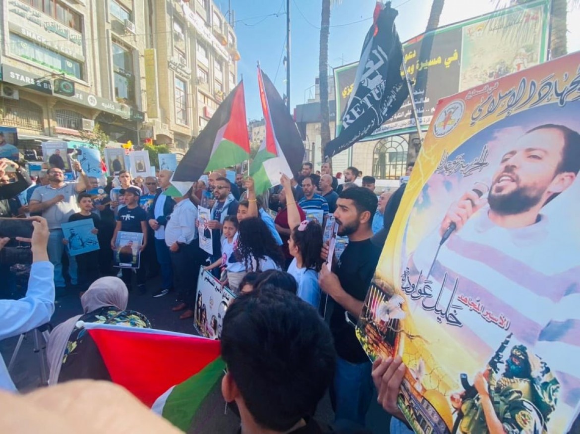 نظمت حركة الجهاد الإسلامي وقفة تضامن وإسناد للأسيرين خليل عواودة ورائد ريان، المضربين عن الطعام رفضاً للاعتقال الإداري، اليوم الثلاثاء 24/5/2022، على دوار المنارة وسط مدينة رام الله، بالضفة المحتلة.