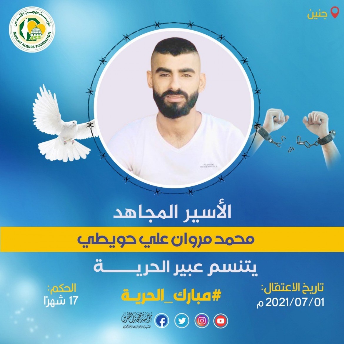 أفـادت مؤســـسـة مهــجـة الـقـدس للـشـهـداء والأسـرى والجرحى؛ أن ســلـطـات الاحتلال الصهـيـوني أفـرجـت مساء أمس الاثنين عن الأسير المجاهد محمد مروان علي حويطي (25 عامًا) من الحارة الشرقية بمحافظة جنين شمال الضفة المحتلة، وذلك بعد أن أمضى في الاعتقال الإداري 17 شهرًا.