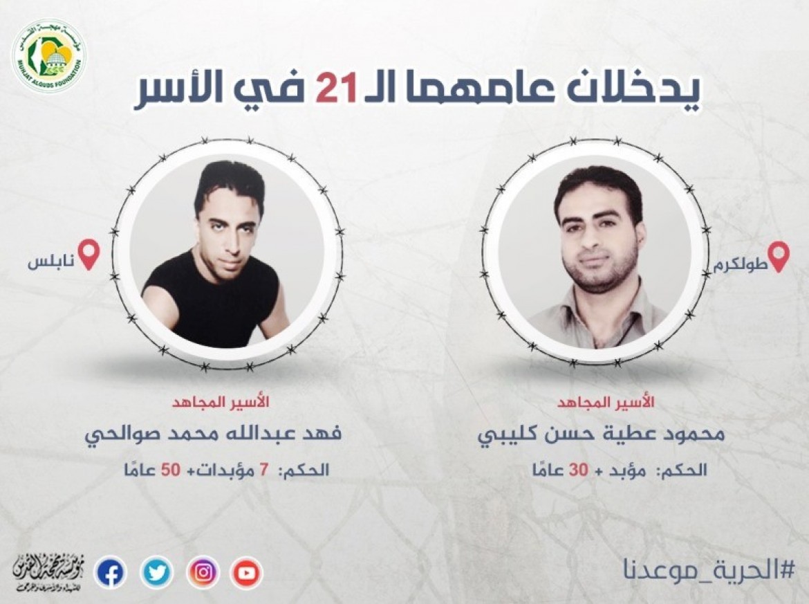 أفادت مؤسسة مهجة القدس للشهداء والأسرى والجرحى؛ اليوم الثلاثاء، أن الأسيران محمود عطية حسن كليبي (41 عامًا) من بلدة شويكة بمحافظة طولكرم شمال الضفة المحتلة، وفهد عبد الله محمد صوالحي (42 عامًا) من مخيم بلاطة بمحافظة نابلس بالضفة المحتلة؛ أنهيا عشرين عامًا على التوالي في الأسر ودخلا اليوم عامهما الحادي والعشرين في سجون الاحتلال.