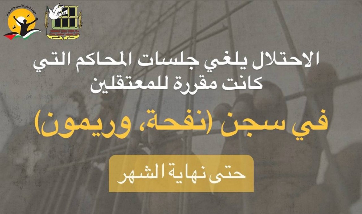 قالت هيئة شؤون الأسرى ونادي الأسير الفلسطينيّ، إنّ محاكم الاحتلال ألغت جلسات محاكم التي كانت مقررة للمعتقلين القابعين في سجني (ريمون، ونفحة) حتى نهاية الشهر الجاري، بدعوى أنّ إدارة السّجون فرضت ما تدعيه (بالحجر الصحي) على الأسرى، نتيجة لانتشار مرض الجرب، مع العلم أنّ جميع جلسات محاكم الأسرى بعد الحرب، تعقد من خلال تقنية الفيديو (كونفرنس).