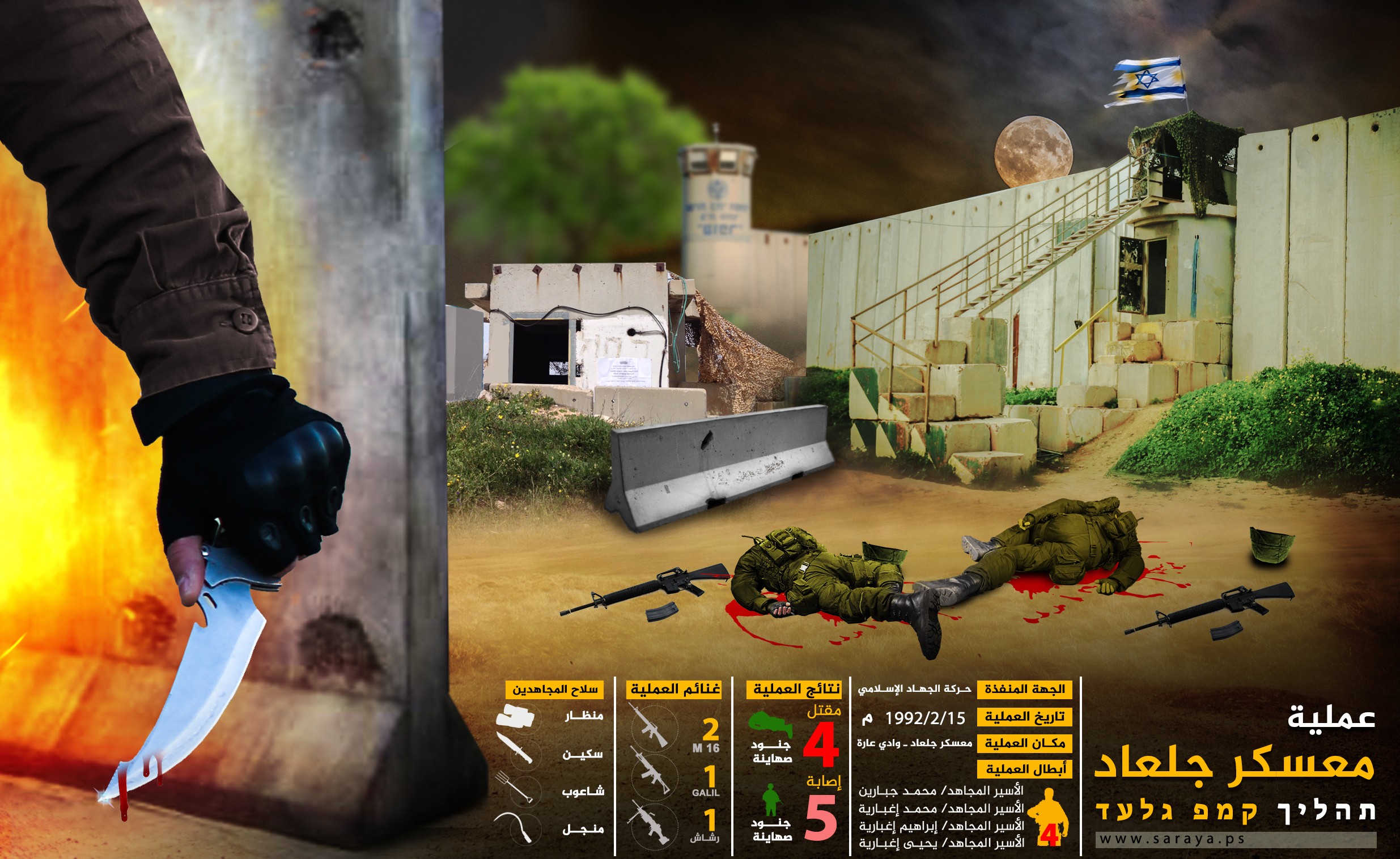 خرج الفرسان الأربعة يوم الخميس 13/2/1992 م من منطقة المشيرفة بالداخل المحتل، وتوجهوا نحو معسكر يبعد عنهم حوالي 10 كيلومترات ، يسمى (جلعاد) وأخذوا سلاحهم ومعداتهم وحفظوها في مكان آمن قرب المعسكر، وبعد يومين، وبالتحديد يوم الجمعة 15/2/1992 م في تلك الساعات المباركة من ظهيرته خرج الأسود لتحقيق الأسطورة حيث أنهم وصلوا إلى مكان يبعد عن المعسكر ما يقارب الستة كيلومترات.